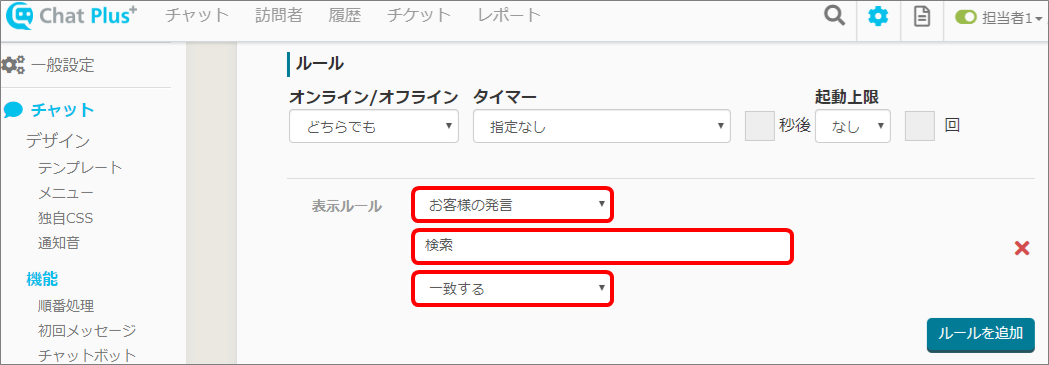 (6) 表示ルールのプルダウンから「お客様の発言」をクリックして選択し、2つ目の枠内に「検索」と入力、3つ目のプルダウンから「一致する」をクリックして選択します。