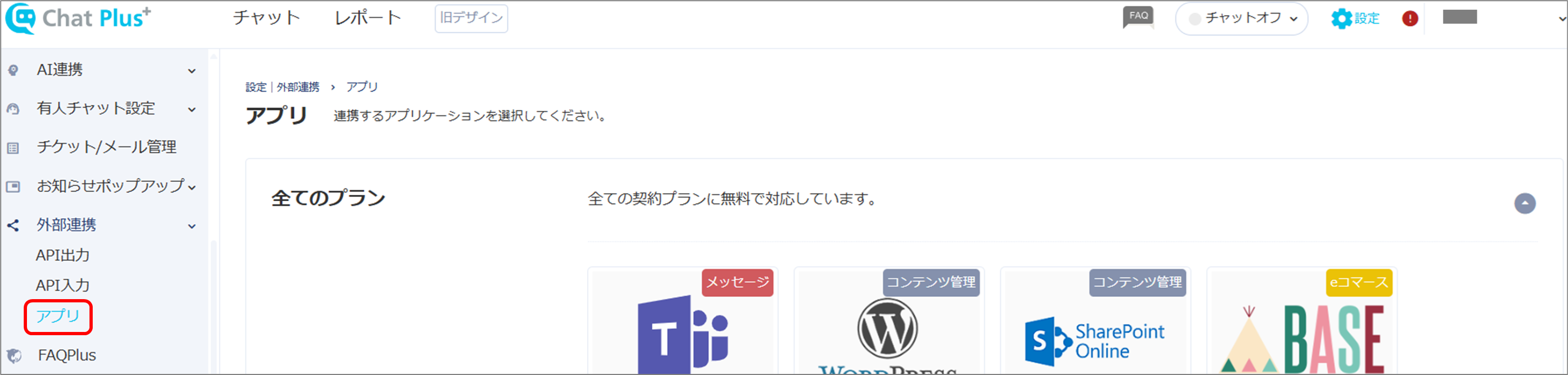 (2) 画面左「外部連携」>「アプリ」をクリックします。