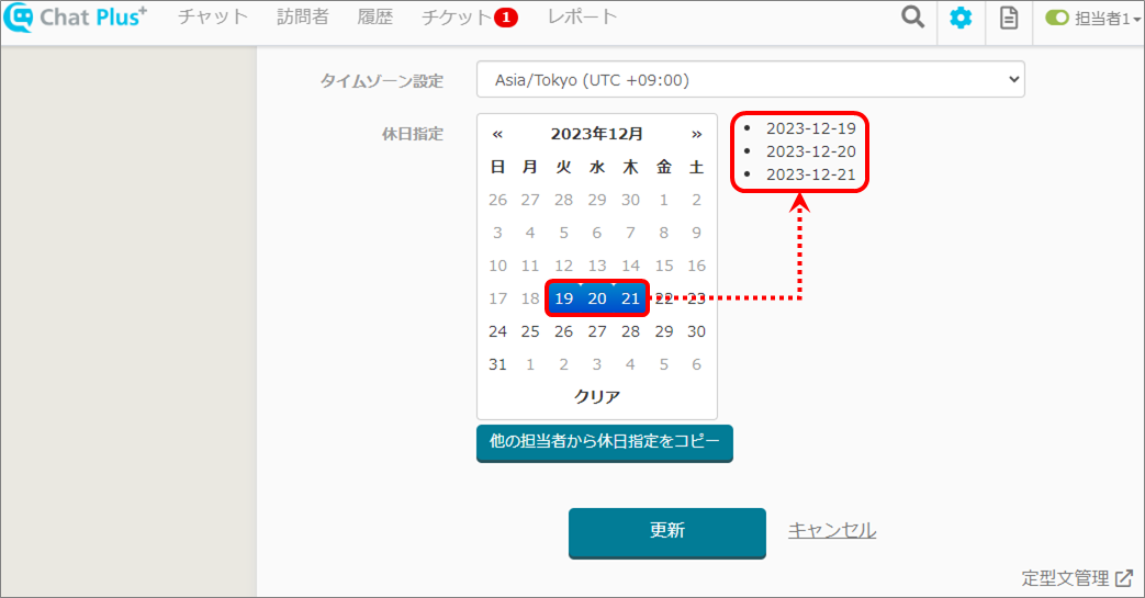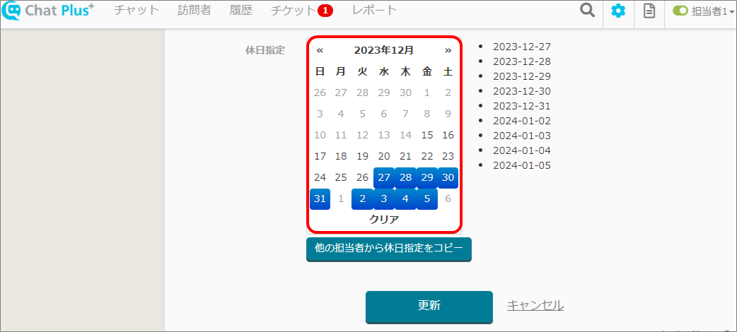 チャットプラスでは、指定した日にちを休日として設定できます。休日を指定すると、該当の日にちはオフラインとなります。