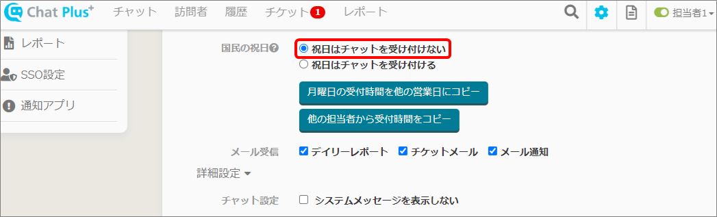 ※同ページ「祝日はチャットを受け付けない」にチェックを入れると、国民の祝日がオフラインになります。