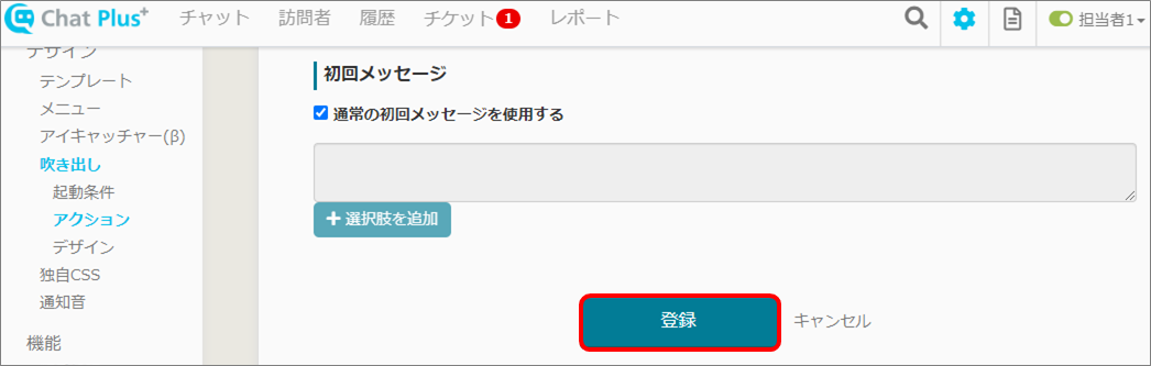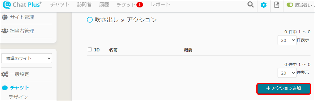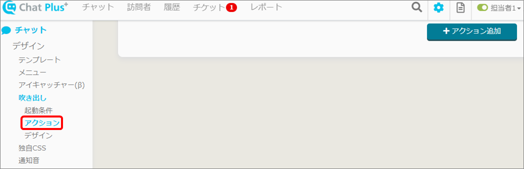 (2) 画面左「チャット」>「デザイン」>「吹き出し」>「アクション」をクリックします。