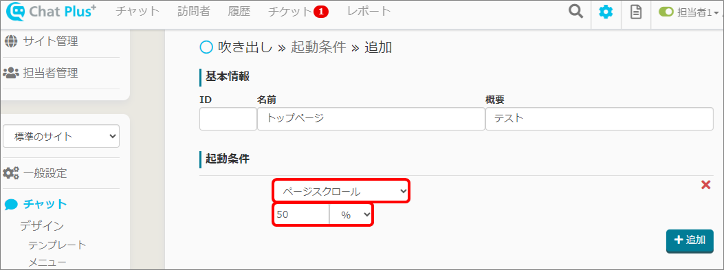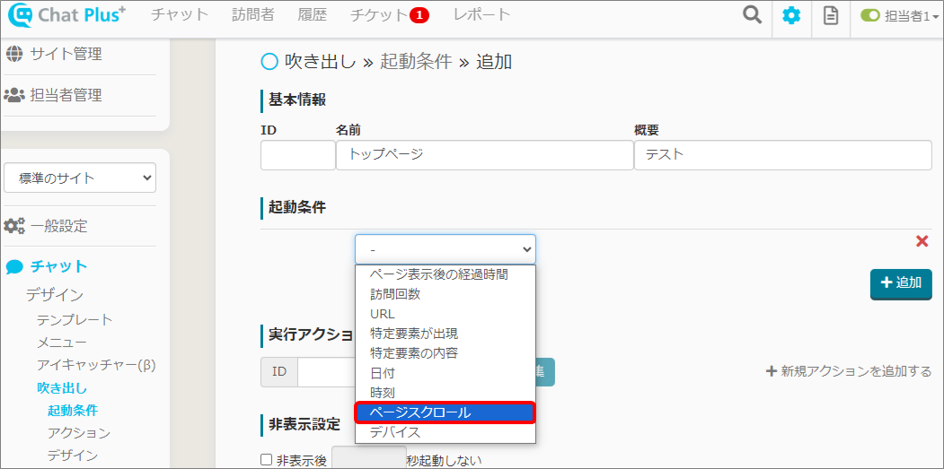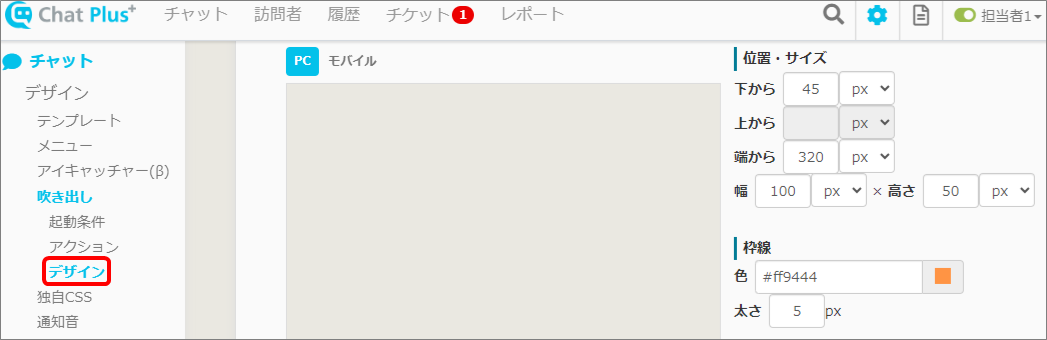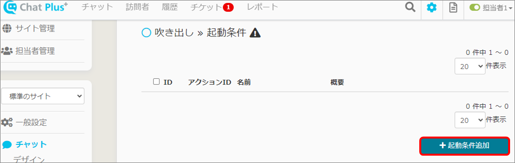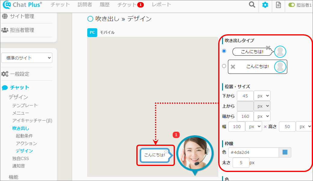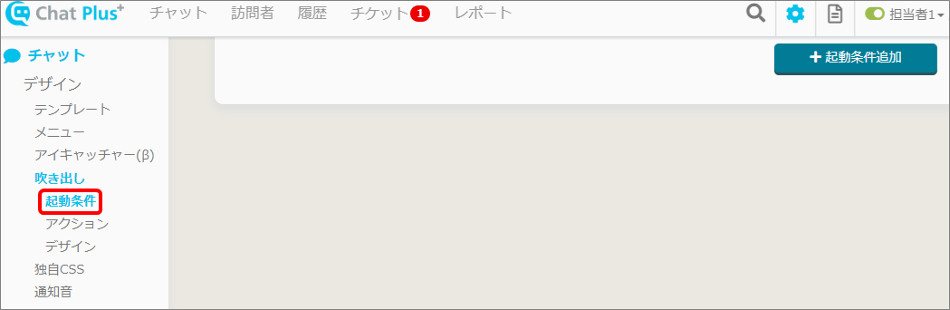 (2) 画面左「チャット」>「デザイン」>「吹き出し」>「起動条件」をクリックします。