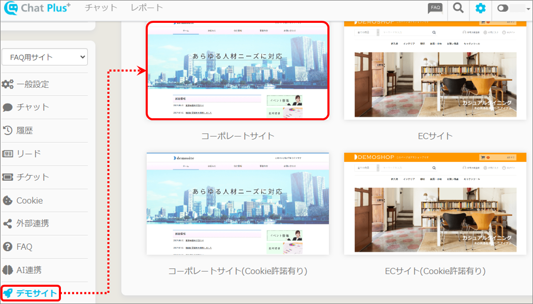 (1) 画面左「デモサイト」をクリックし、デモサイトから動作確認を行います。