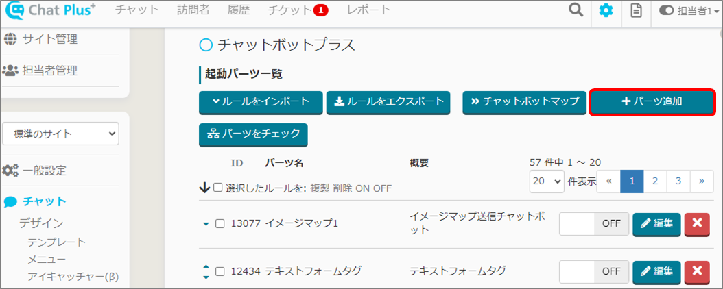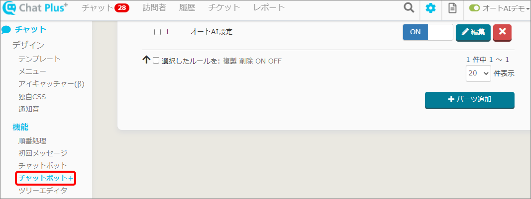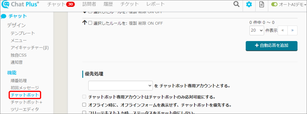 (1) 画面左「チャット」>「機能」>「チャットボット+」をクリックします。