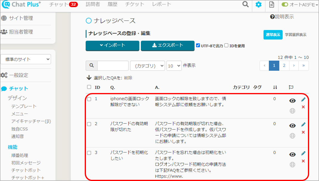 (1) 画面左「チャット」>「機能」>「チャットボット」をクリックします。