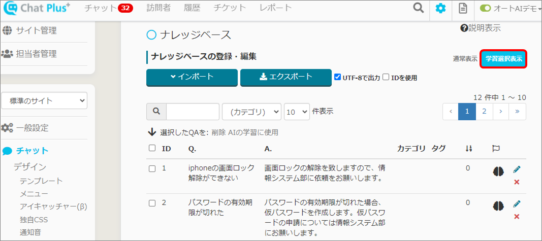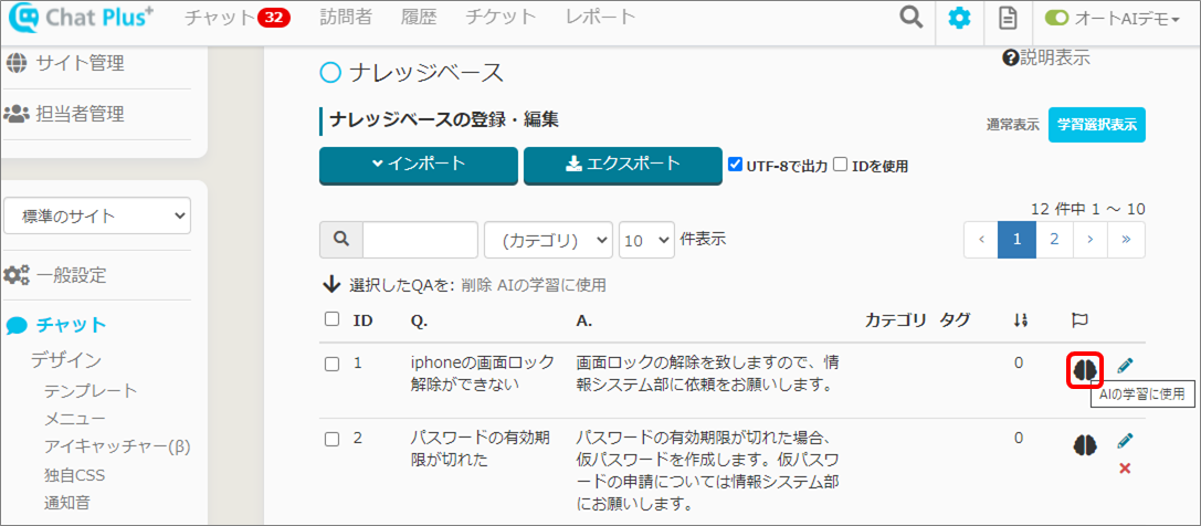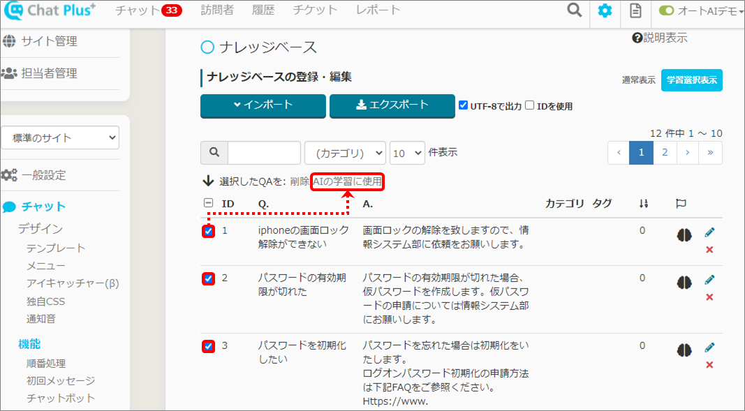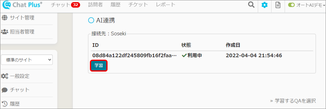 (3) AI に使用したいナレッジベースにチェックを入れ、「AI の学習に使用」をクリックします。
