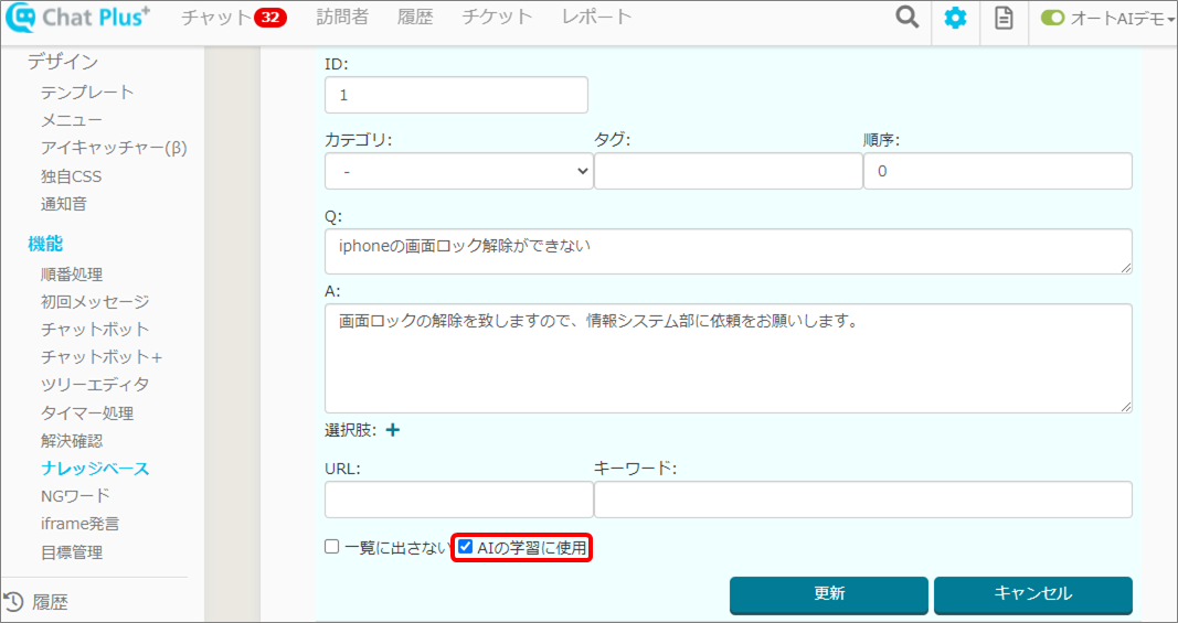 ■ナレッジベース登録時、「AI の学習に使用」にチェックを入れる