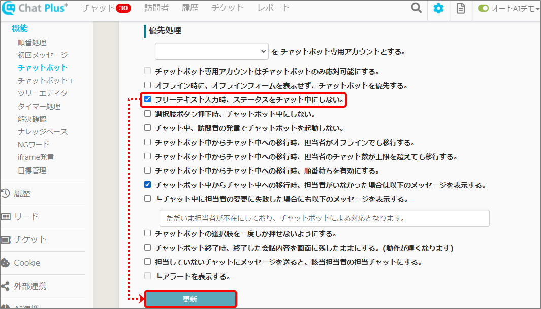 (2)「優先処理」の「フリーテキスト入力時、ステータスをチャット中にしない。」にチェックを入れ、「更新」ボタンをクリックします。