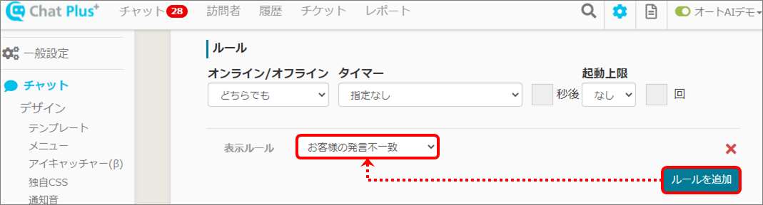 (4)「ルールを追加」ボタンをクリックし、表示ルールのプルダウンから「お客様の発言不一致」をクリックして選択します。
