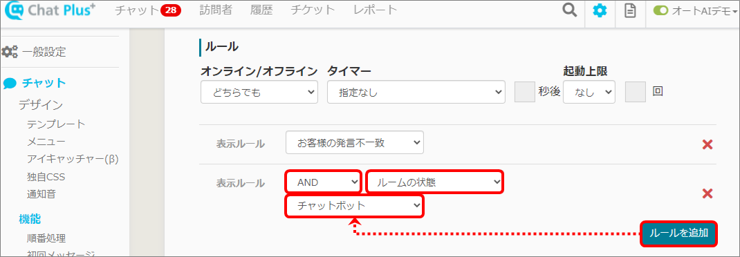 (5) 再度「ルールを追加」ボタンをクリックし、表示ルールのプルダウンからそれぞれ「AND」「ルームの状態」「チャットボット」をクリックして選択します。
