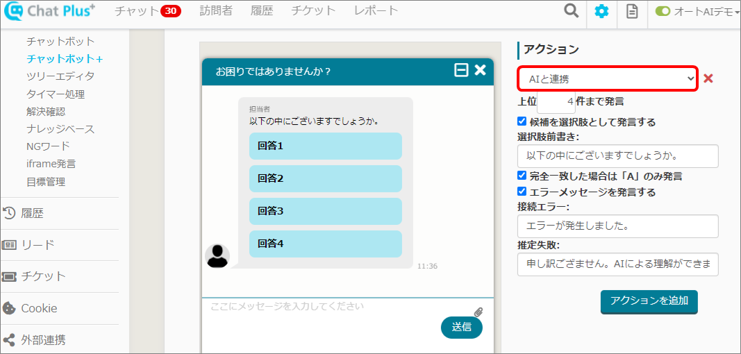 チャットプラスでは、世界最先端の質問応答 AI モデル「ChatPlusAI」または「Sōseki」と連携し、学習データの用意なく、簡単にフリーワード対応型の AI チャットボットを設定できます。