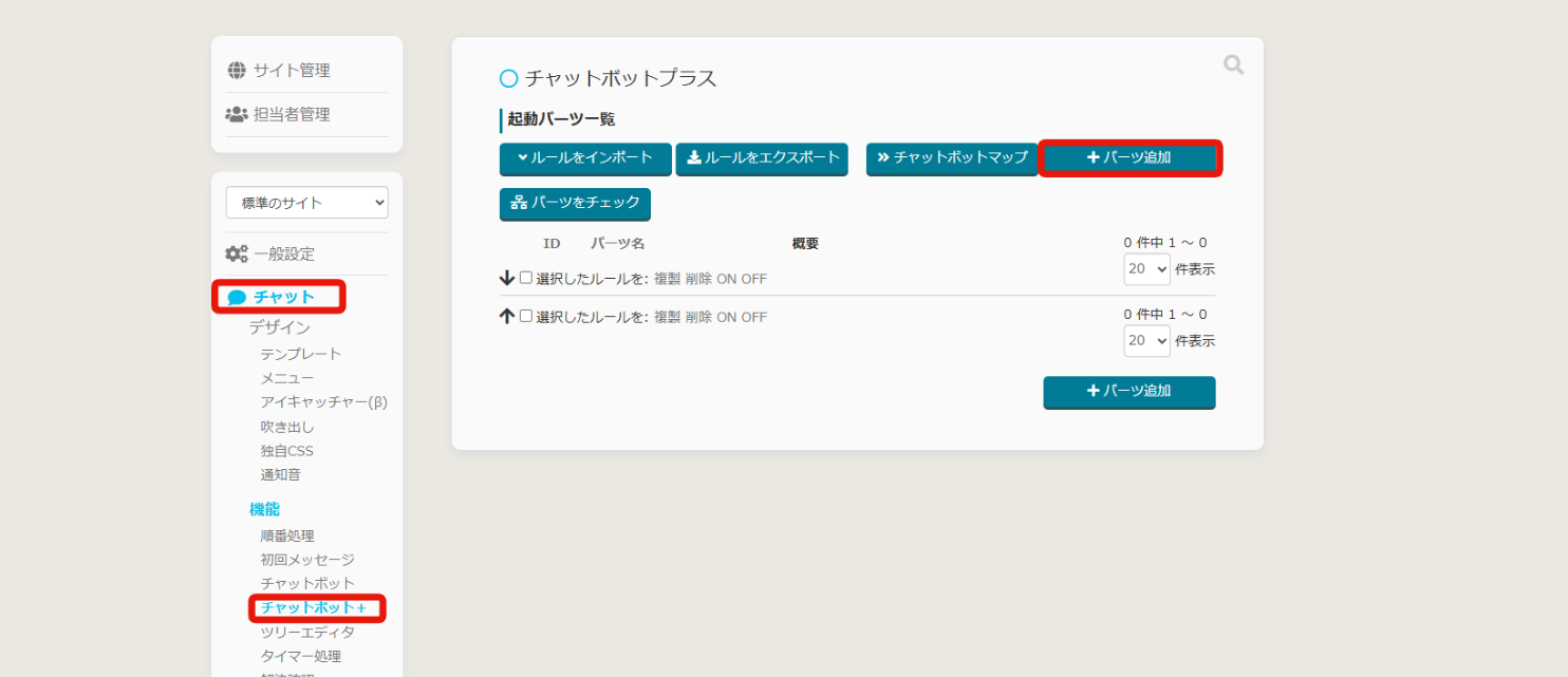 (2) 管理画面左の「チャット」>「チャットボット+」から「パーツを追加」をクリックします。