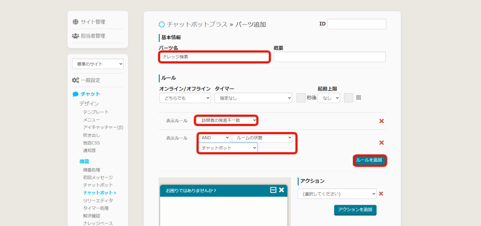 (3)「パーツ名」を記入し、「ルールを追加」ボタンをクリックし「訪問者の発言不一致」にします。再び「ルールを追加」ボタンをクリックし「ルームの状態」を「チャットボット」にします。