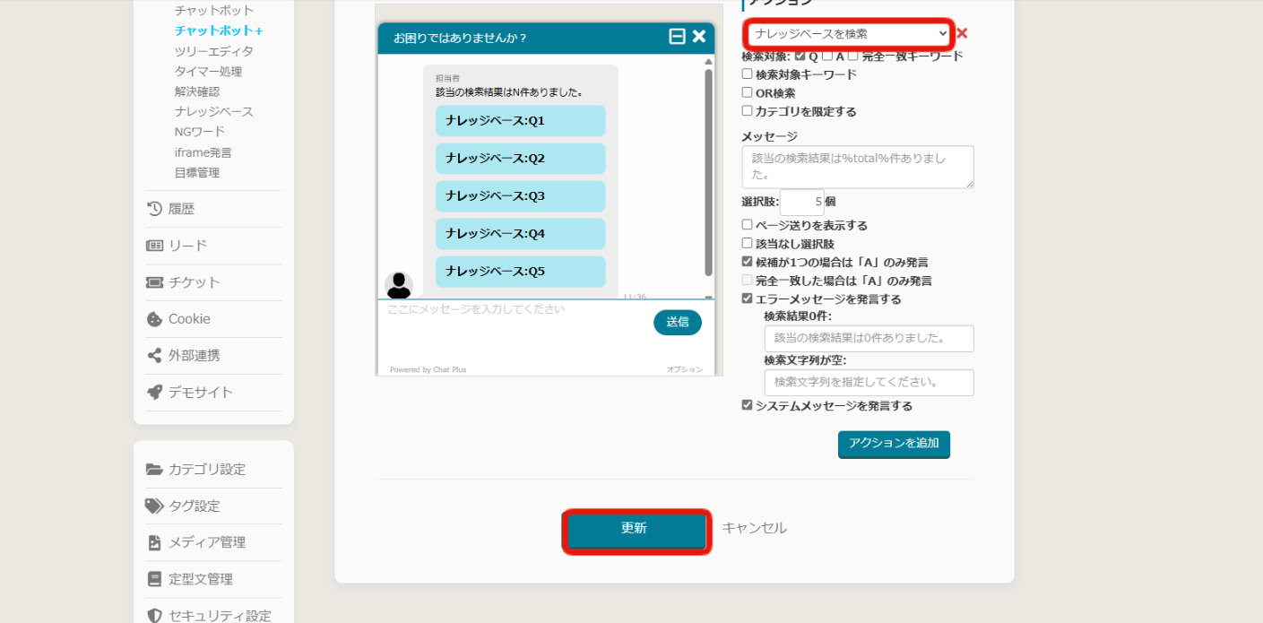 (4)「アクション」のプルダウンから、「ナレッジベースを検索する」をクリックし、「更新」ボタンをクリックします。