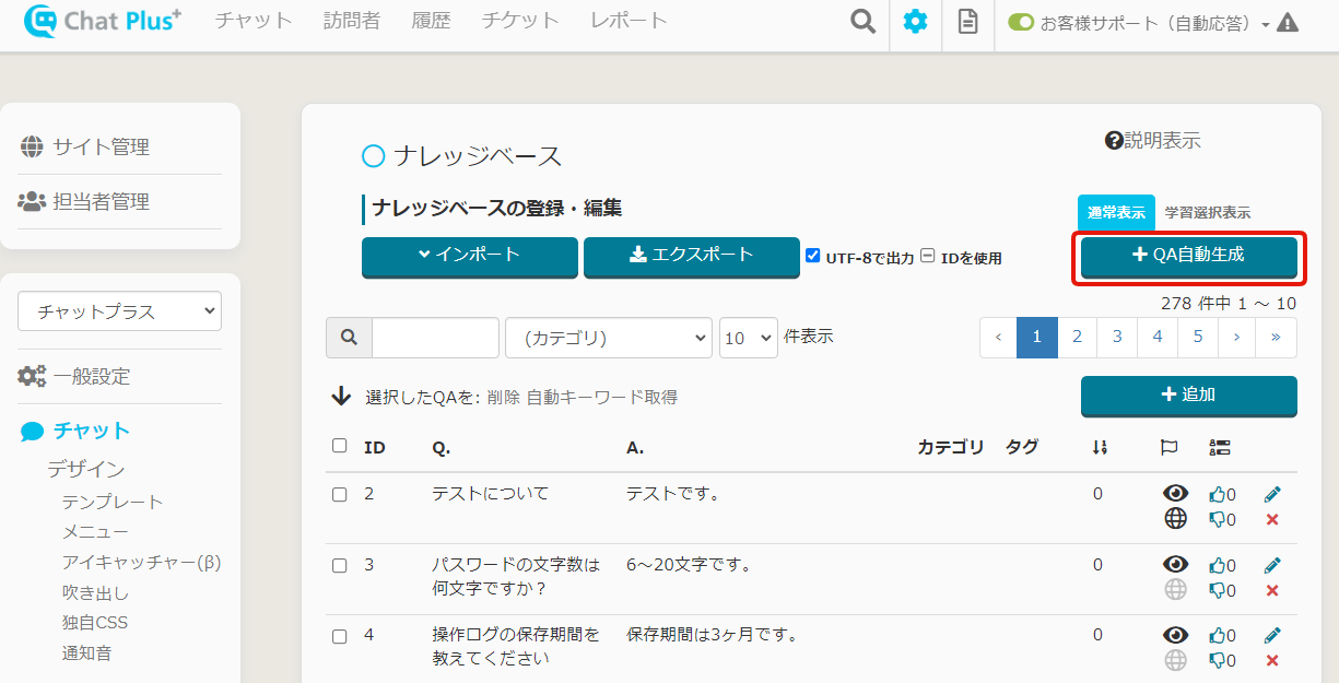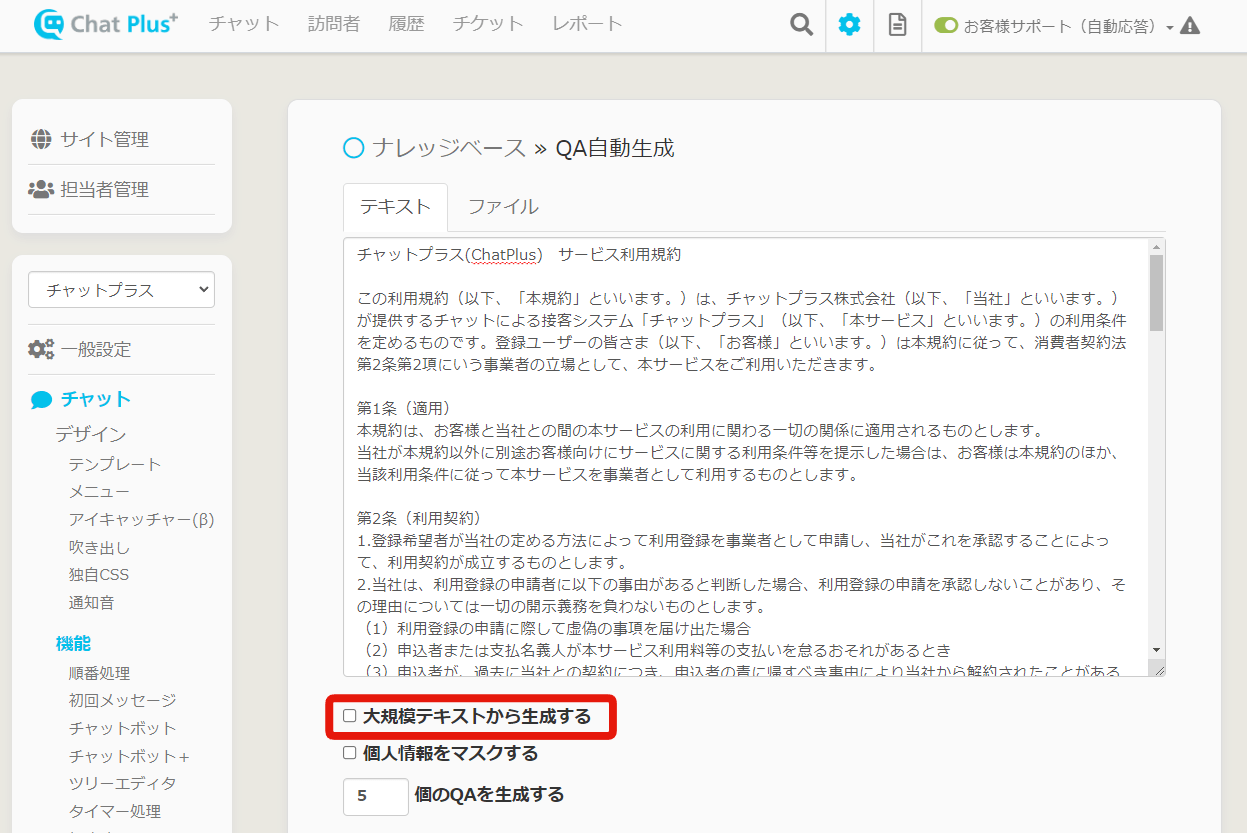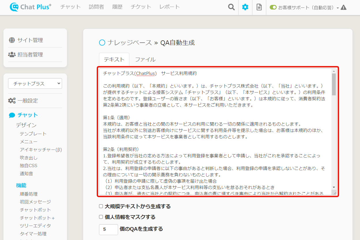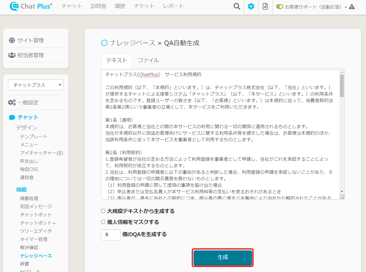 チャットプラスでは、ChatGPT を用いてナレッジベースの Q&A の自動生成ができます。