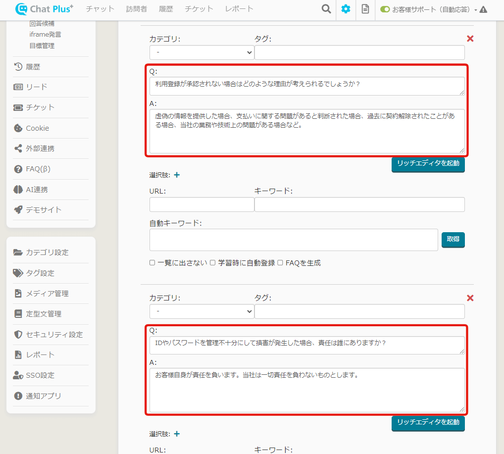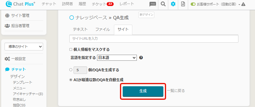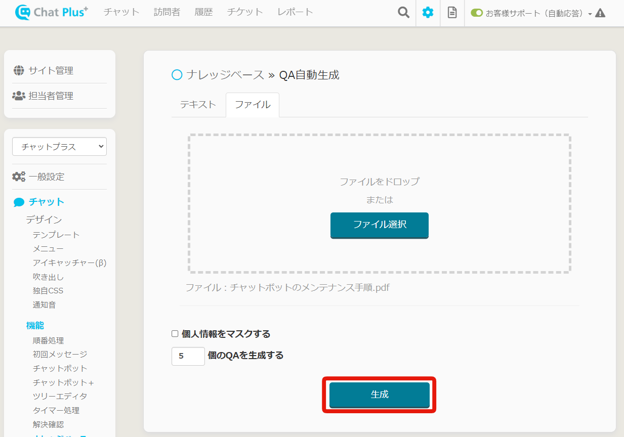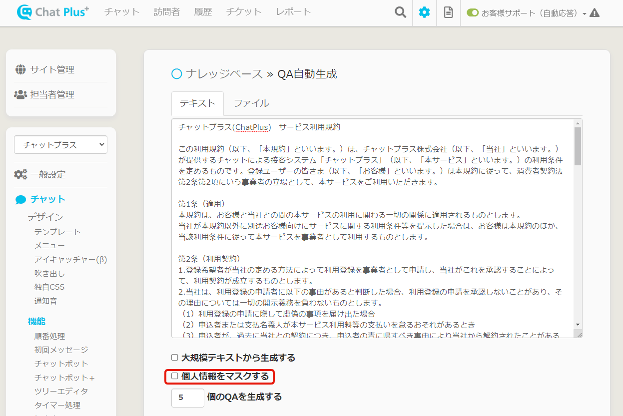 チャットプラスでは、ChatGPT を用いてナレッジベースの Q&A の自動生成ができます。