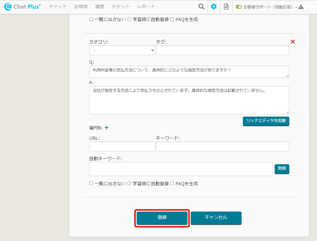 (7) 生成された Q&A をご確認いただき、画面下部の「登録」をクリックすると、ナレッジベースに追加されます。