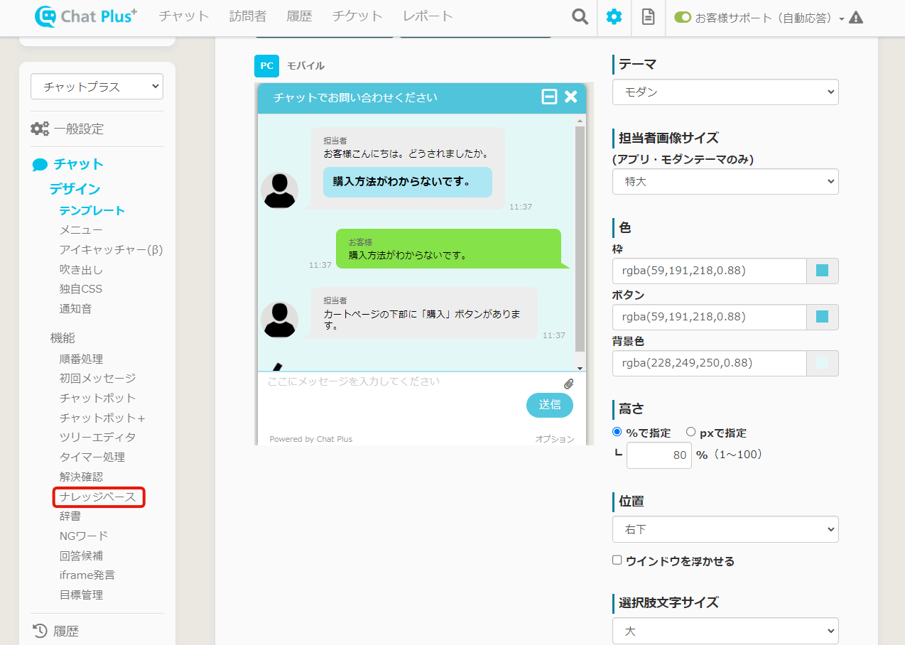 (2) 画面左「チャット」>「機能」>「ナレッジベース」をクリックします。