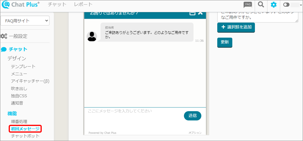 (2) 画面左「チャット」>「機能>「初回メッセージ」をクリックします。