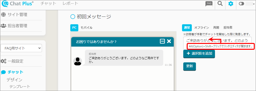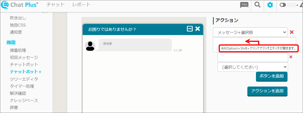※アクションのプルダウンから「メッセージ+選択肢」をクリックして選択した場合、「Alt」+「Shift」+クリックで、リッチエディタウィンドウが起動します。