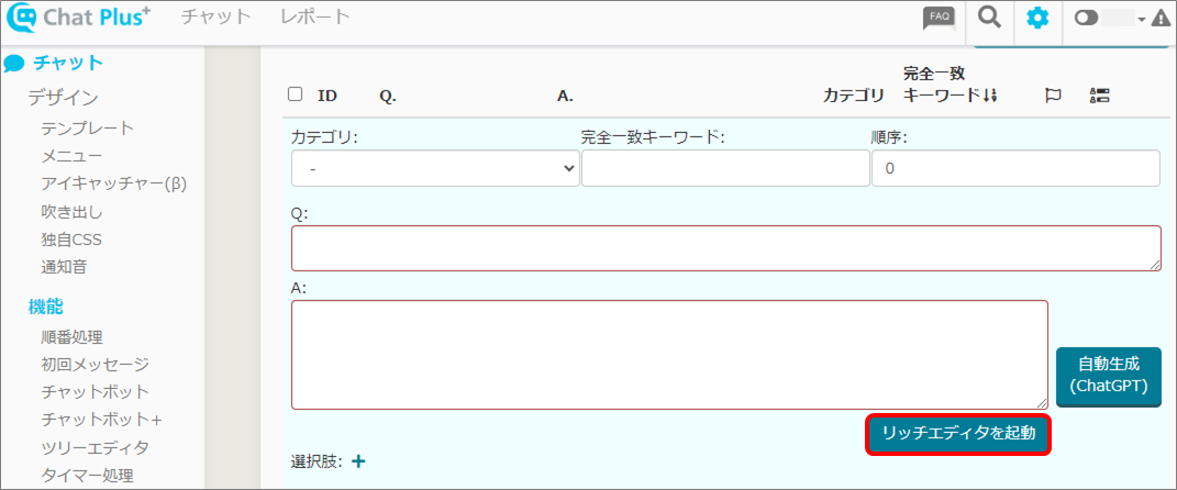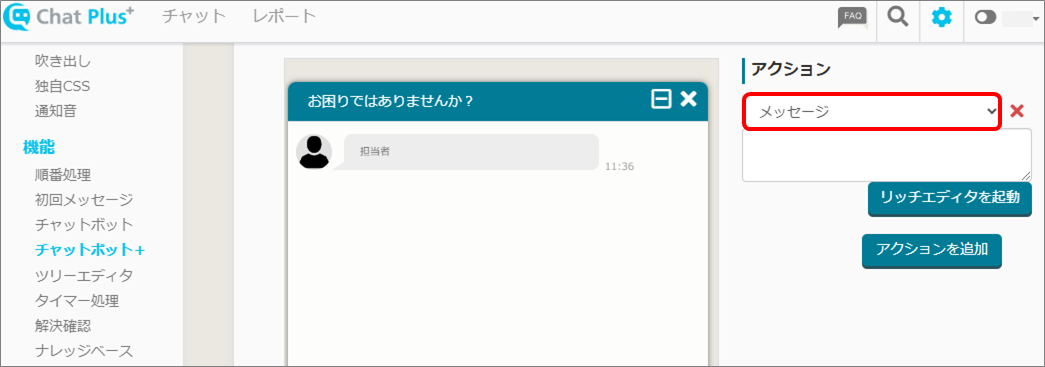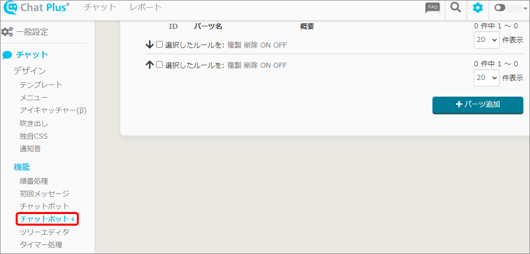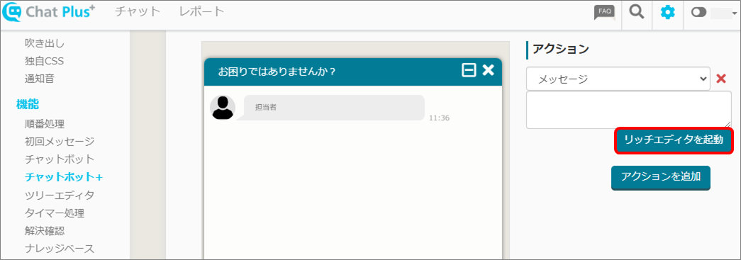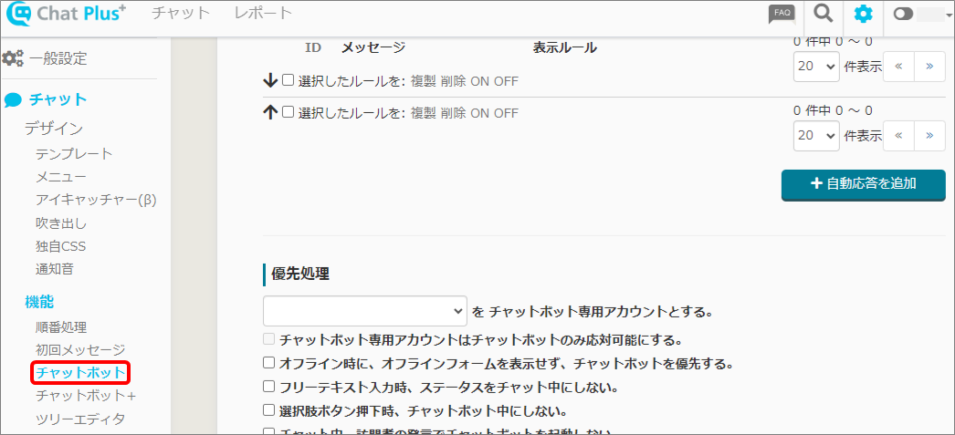 (2) 画面左「チャット」>「機能>「チャットボット+」をクリックします。