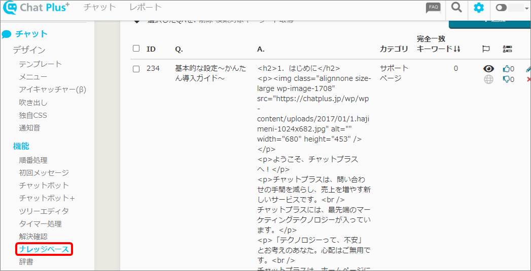 (2) 画面左「チャット」>「機能>「ナレッジベース」をクリックします。