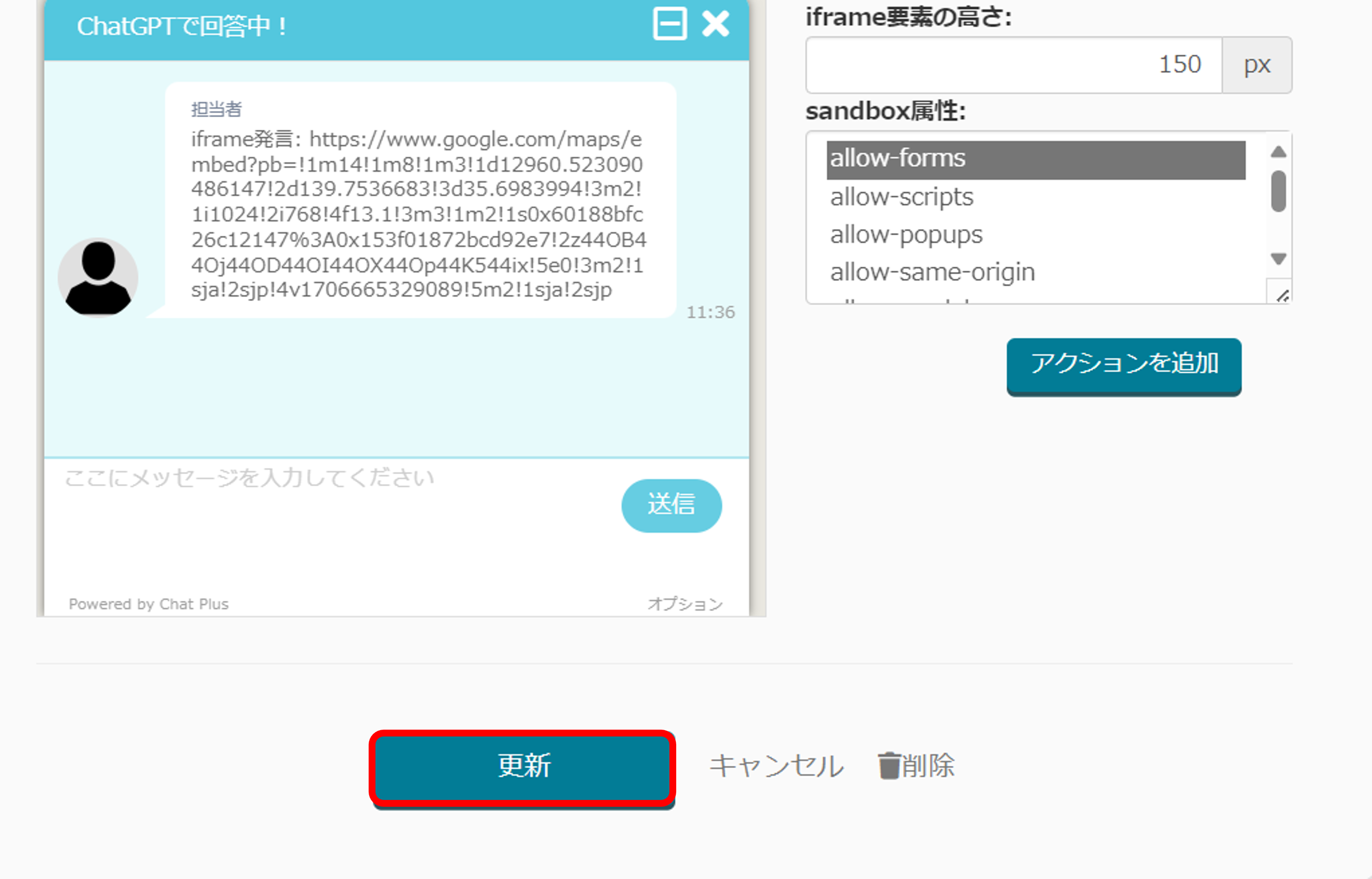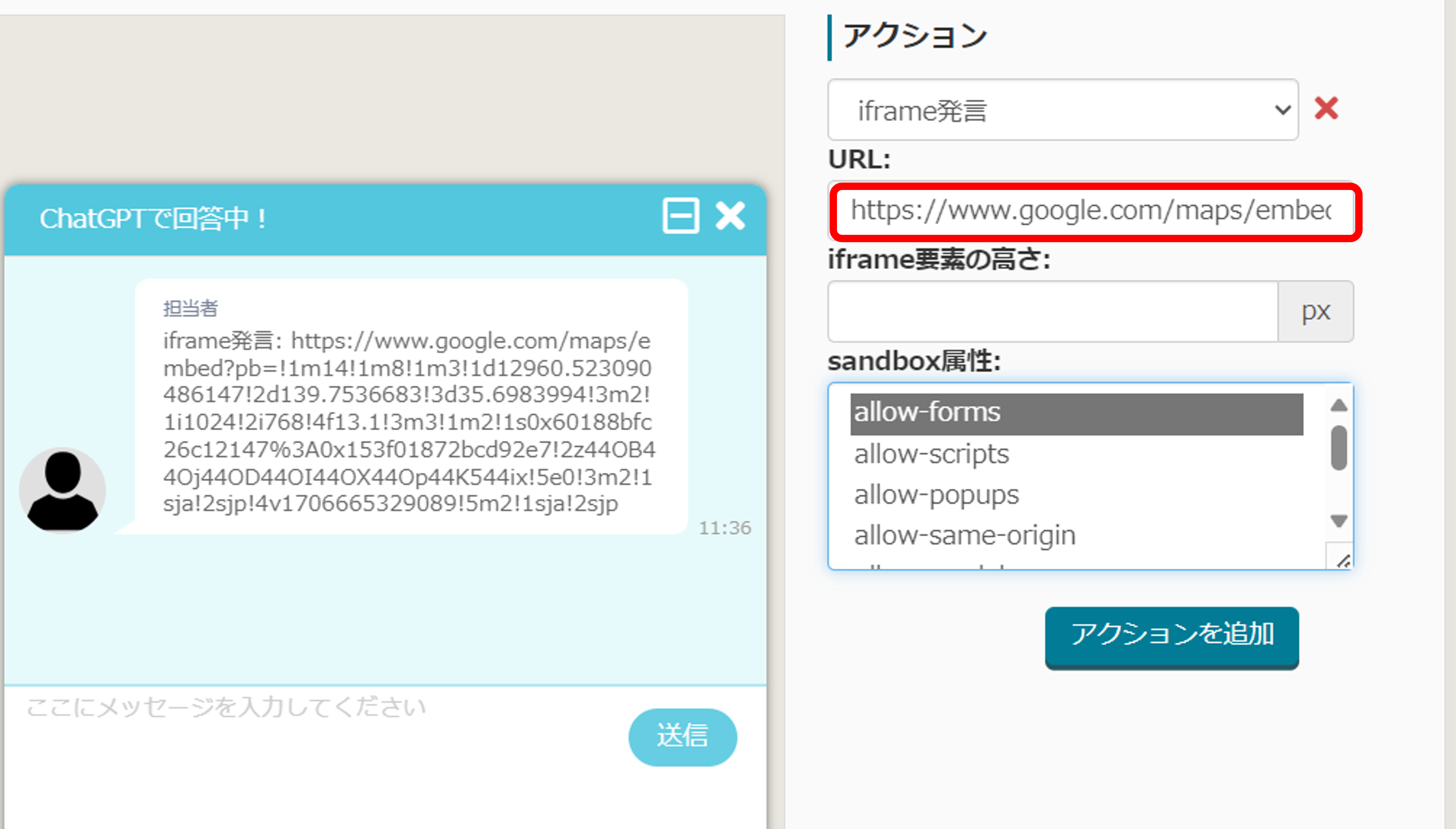 iframe発言を設定すると、チャットウィンドウ内に外部のURLをiframe形式で表示できます。