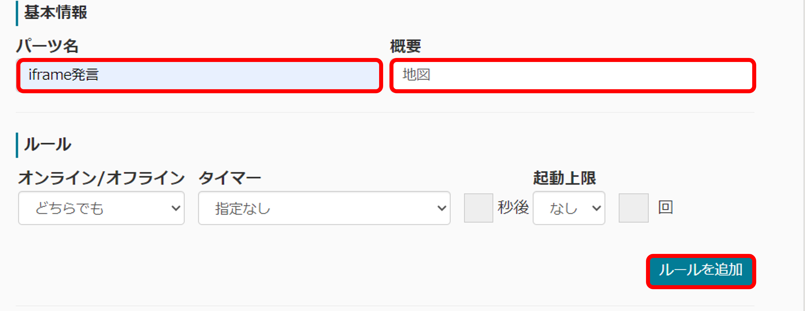 (4)「パーツ名」「概要」を入力し、「ルールを追加」ボタンをクリックします。