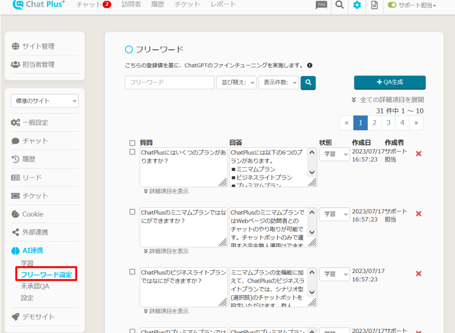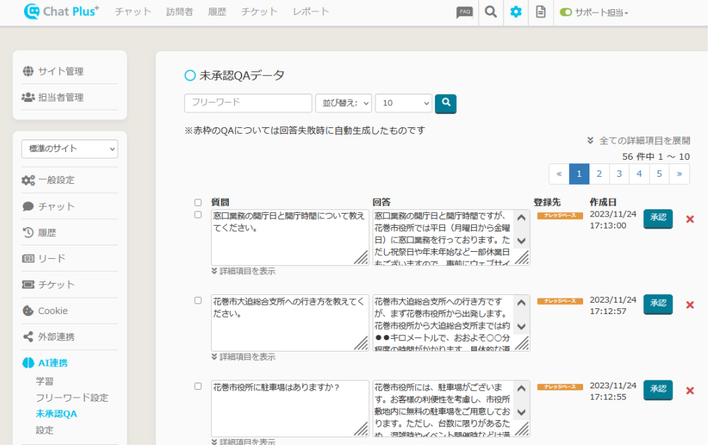 Q&Aの生成量が多い場合は処理がバックグラウンド化されます。しばらくお待ちいただきますと、歯車ボタン>AI 連携>未承認QAにデータが作られます。生成されたQ&Aはページの下部に並びます。必要な場合は修正をしていただく、また不要なものを×ボタンで削除いただき「承認」ボタンをクリックすると、該当のQ&Aがフリーワードに反映されます。