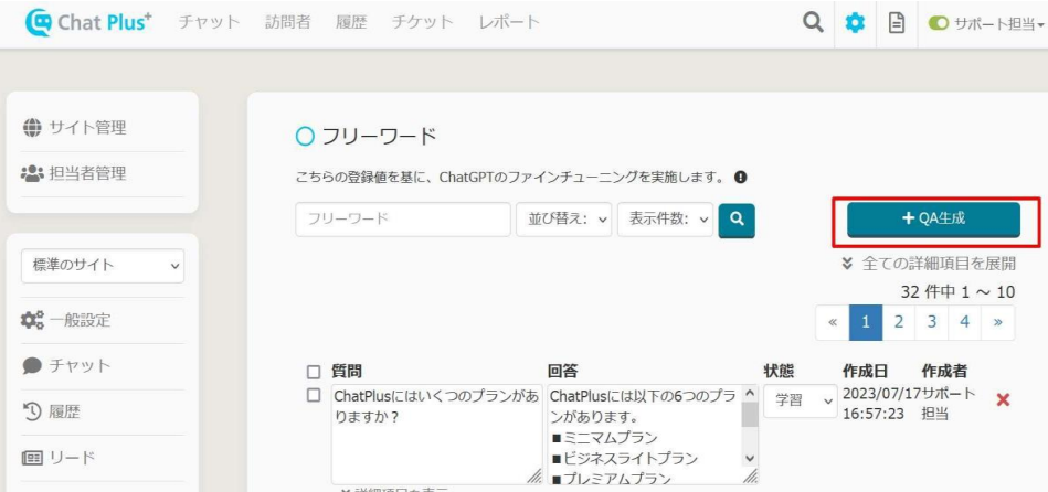 またQ&Aを自動生成することもできます。歯車ボタン>AI 連携>フリーワード設定>QA 生成から、Q&Aを自動生成できます。自動生成は、テキスト、ファイル(PDF、Word、Excel、PowerPoint)、URLから生成できます。生成時、「生成可能な数だけQAを作成する」にチェックを入れていただけますと、最大個数生成できます。