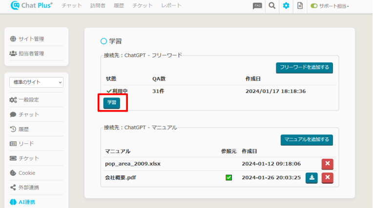 ChatGPT連携をする際、学習方法はフリーワードとマニュアルの2パターンあります。