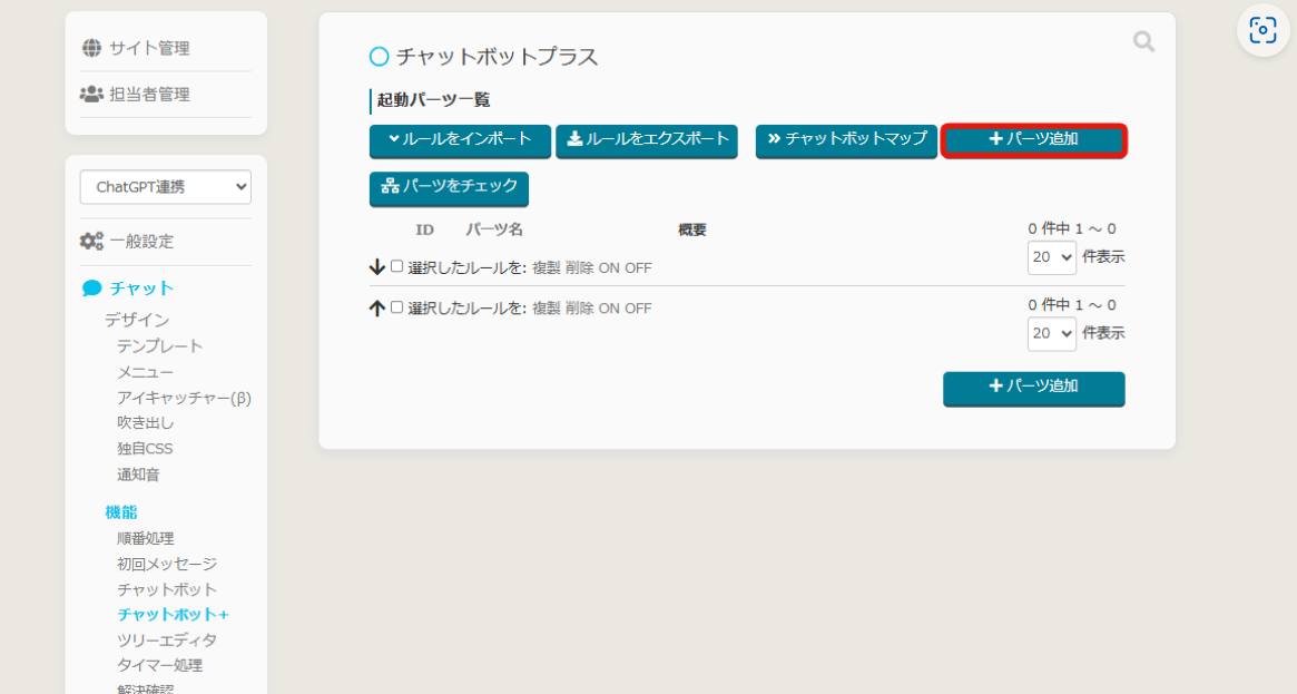 (3)チャット>チャットボット+より、パーツを追加をクリックします。