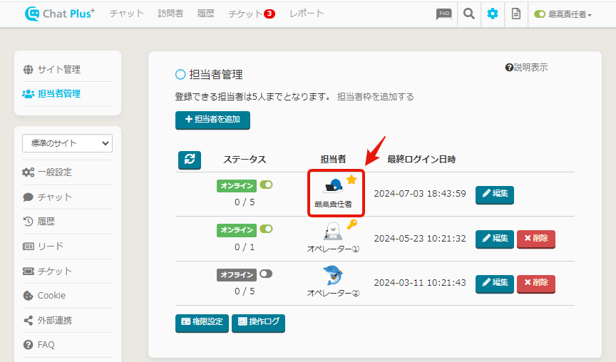 担当者管理画面で、星(☆)マークが付いているアカウントが最高責任者(最高管理者)となります。
