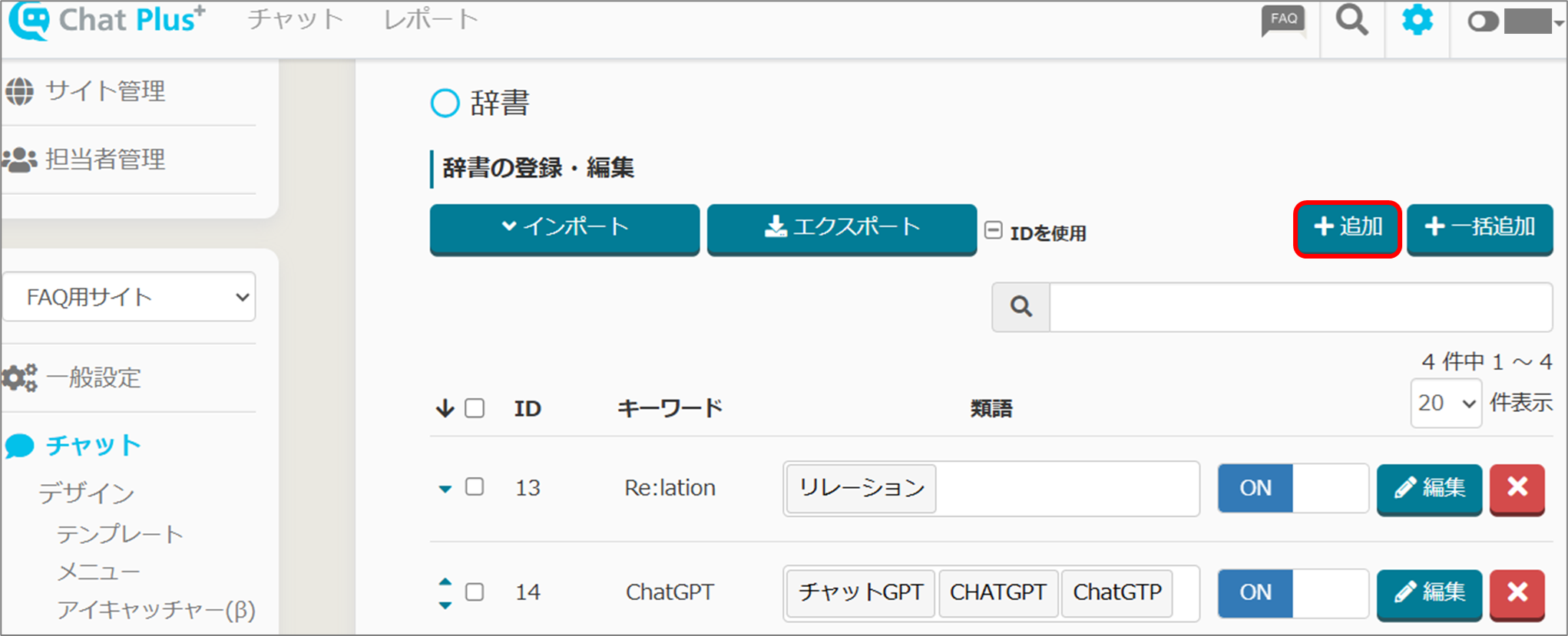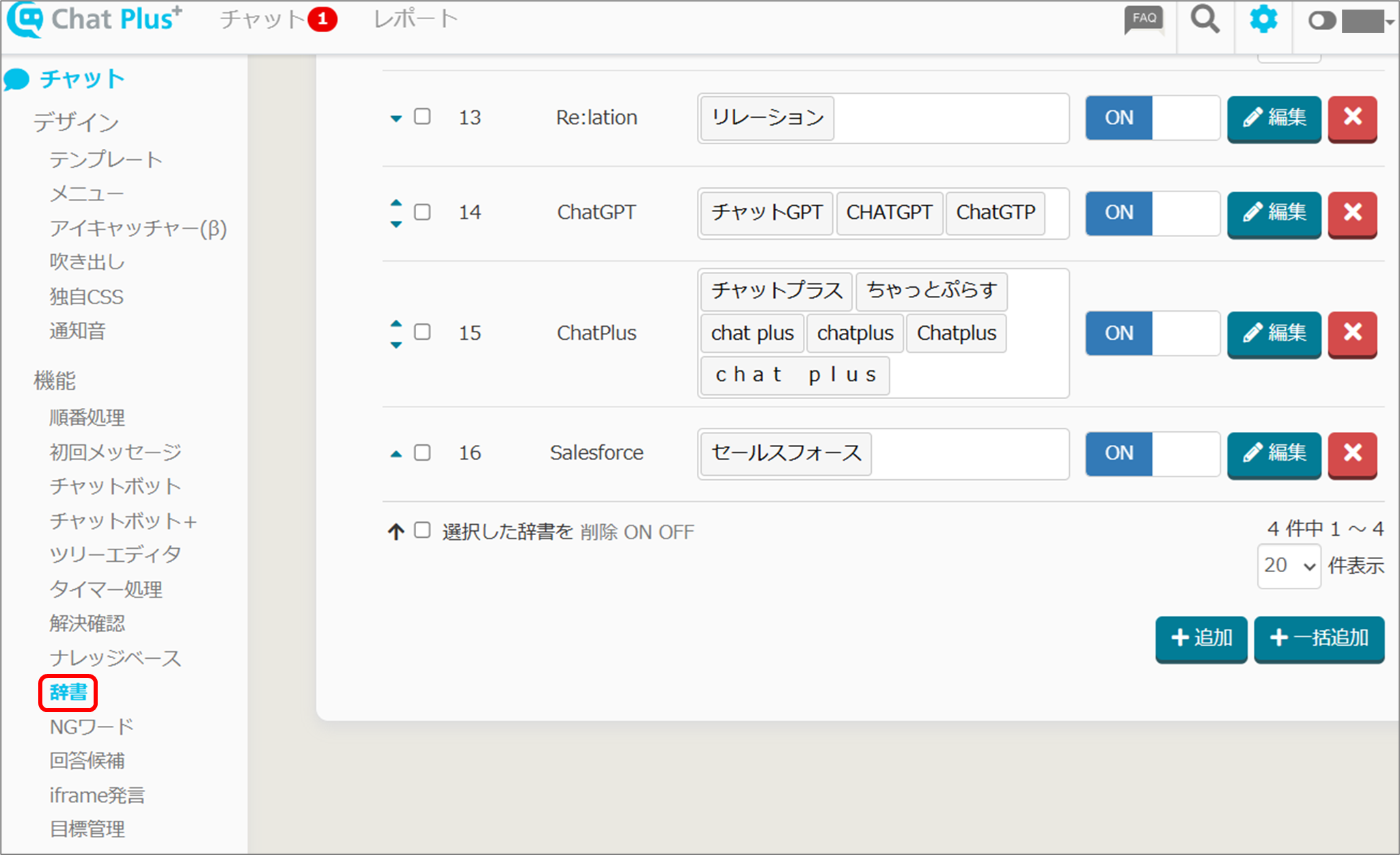 (2) 画面左「チャット」>「機能」>「辞書」をクリックします。
