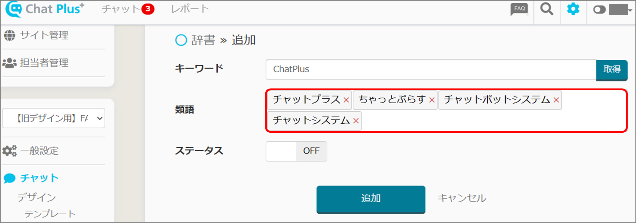 キーワードに正しい言葉を入力し、同時に類語を登録することで、訪問者が別の言い回しをしても、正しい回答を出力することができます。