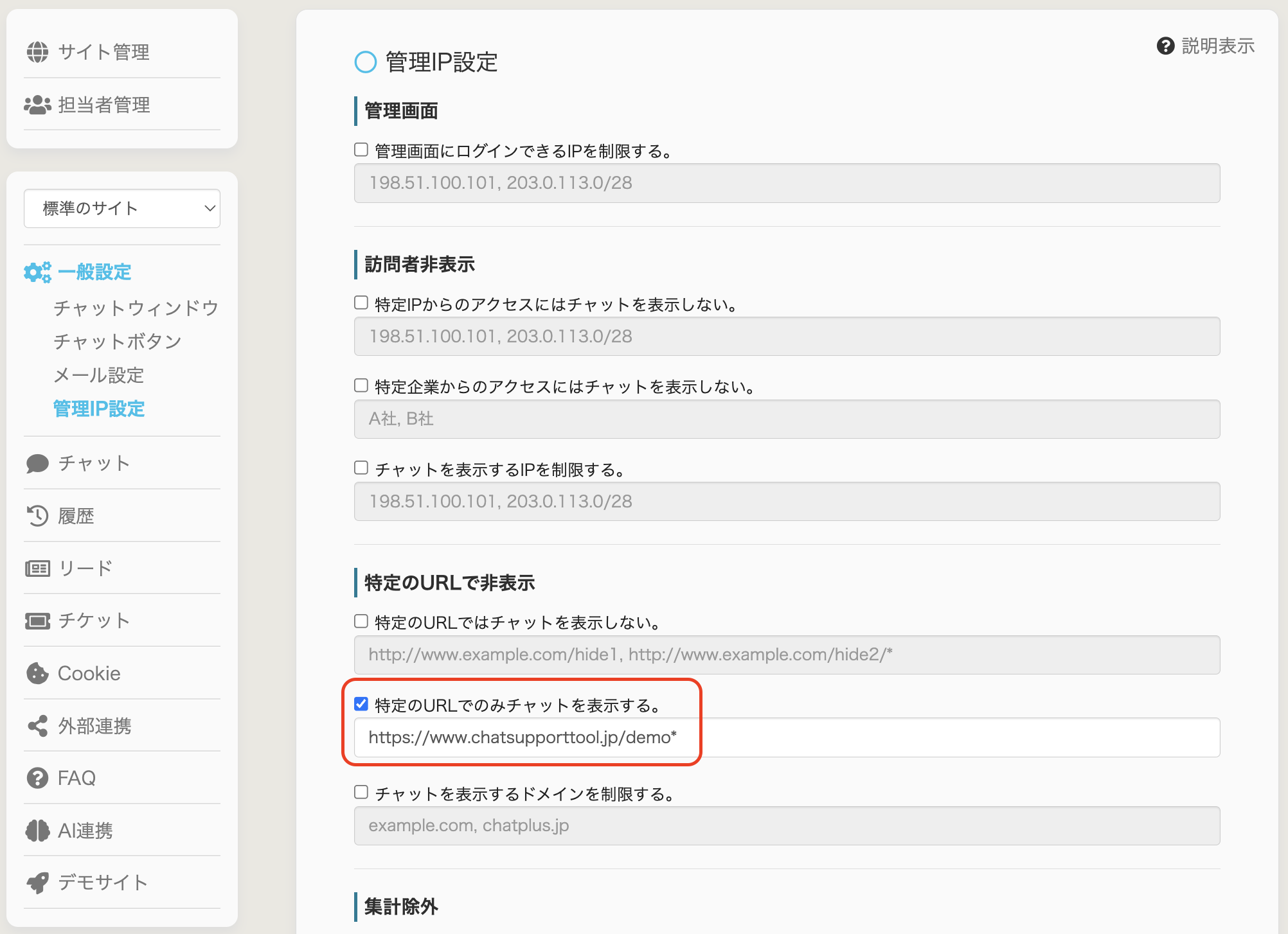 前後に「*」を入れることで、そのドメインを含む全てのURLでチャットを表示しないよう設定できます。