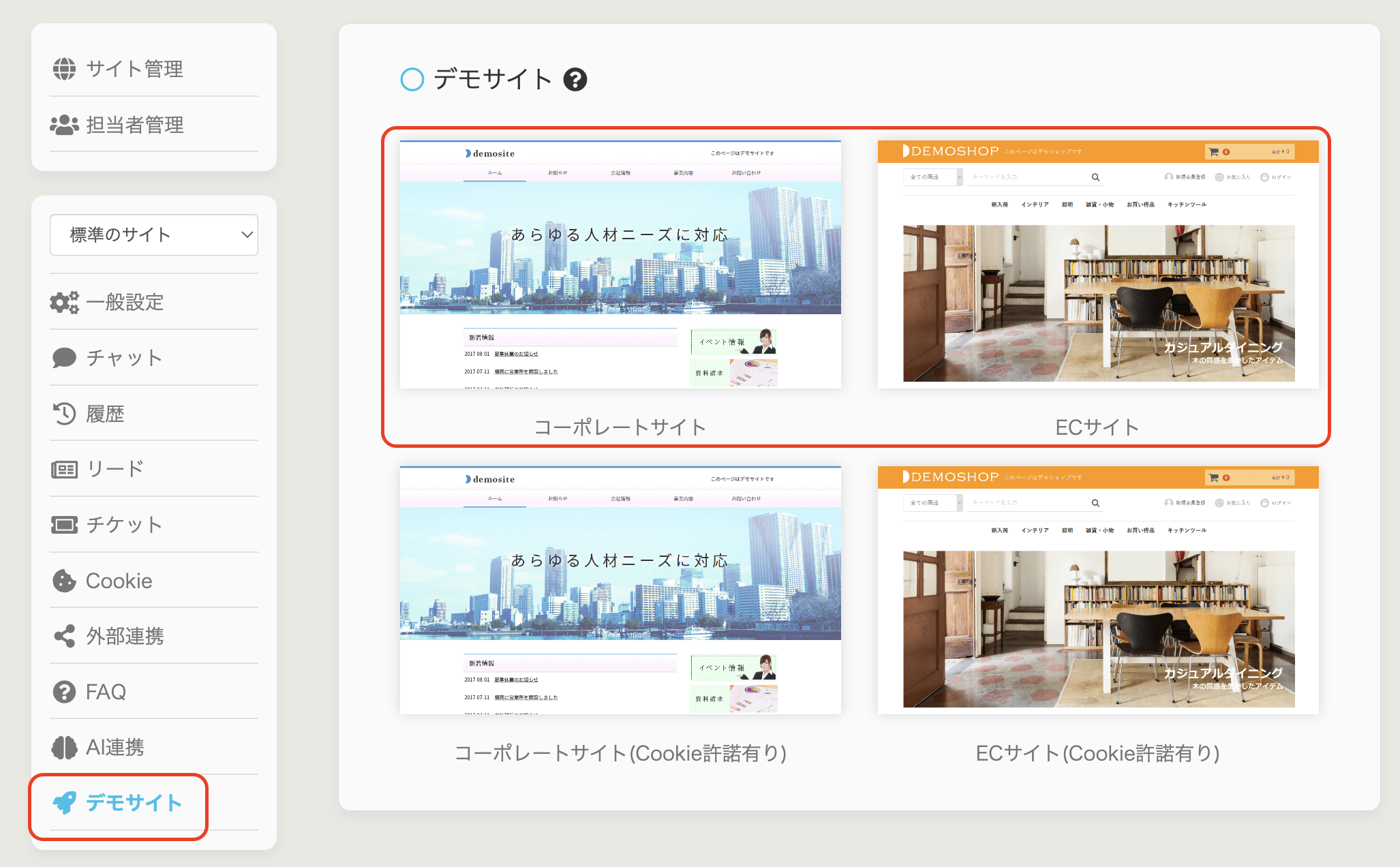 デモサイトにのみチャットを表示させ、チャットの動作確認を行うことも可能です。