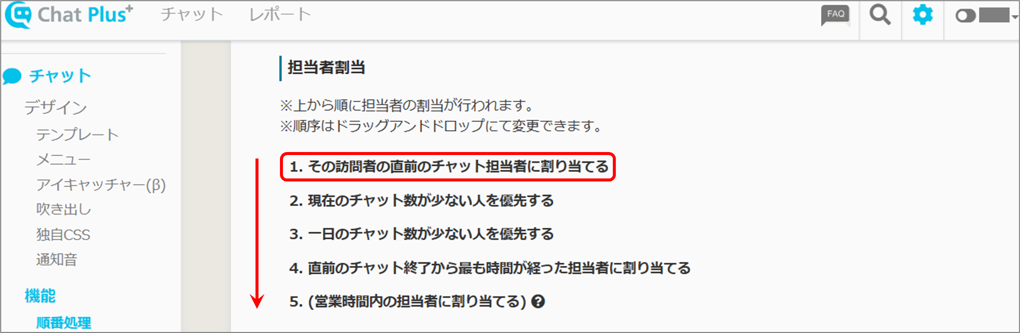 「担当者割当」の現在表示されている上から順に、担当者へチャットの割り当てが行われます。